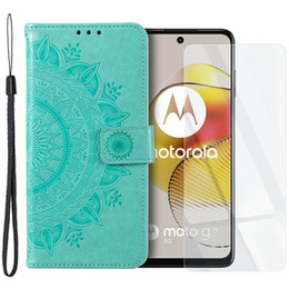 Zestaw Etui z klapką do Motorola Moto G73 5G, portfel Mandala, Zielone + szkło